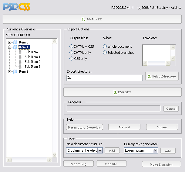 Im working on extended script which will export whole page webdesign from .PSD to .CSS standart structured .XHTML (with images, backgrounds, relative & absolute positioning,...).